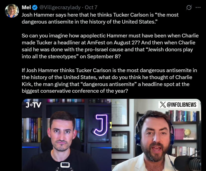 FACT: That same night before the assassination, Josh Hammer told us he had a meeting with Charlie wherein he claimed Charlie hadn’t changed his mind on israel. He neglected to say anything about Charlie’s group chat statement from the previous day.
