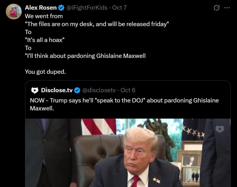 And in closing are we noticing that the Snake in Chief seems to have no interest whatsoever in the Charlie Kirk investigation, but is instead considering a pardon for the child sex trafficker and sexual predator Ghislaine Maxwell?
