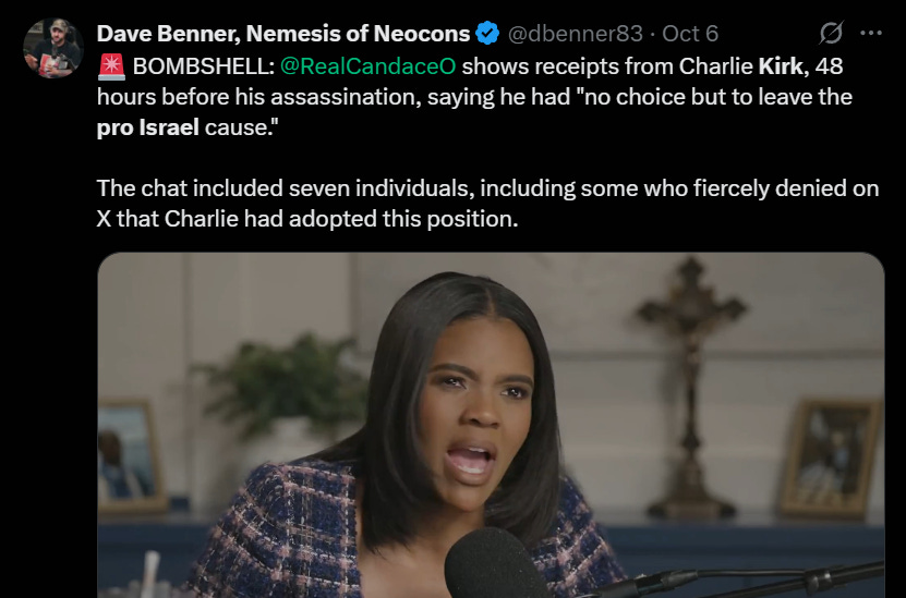 Just as Charlie Kirk was beginning to wake up to the parasite called IsraHell, he was assassinated in public 48 hours later after this text message exchange with Candace Owens on September 8, 2025.